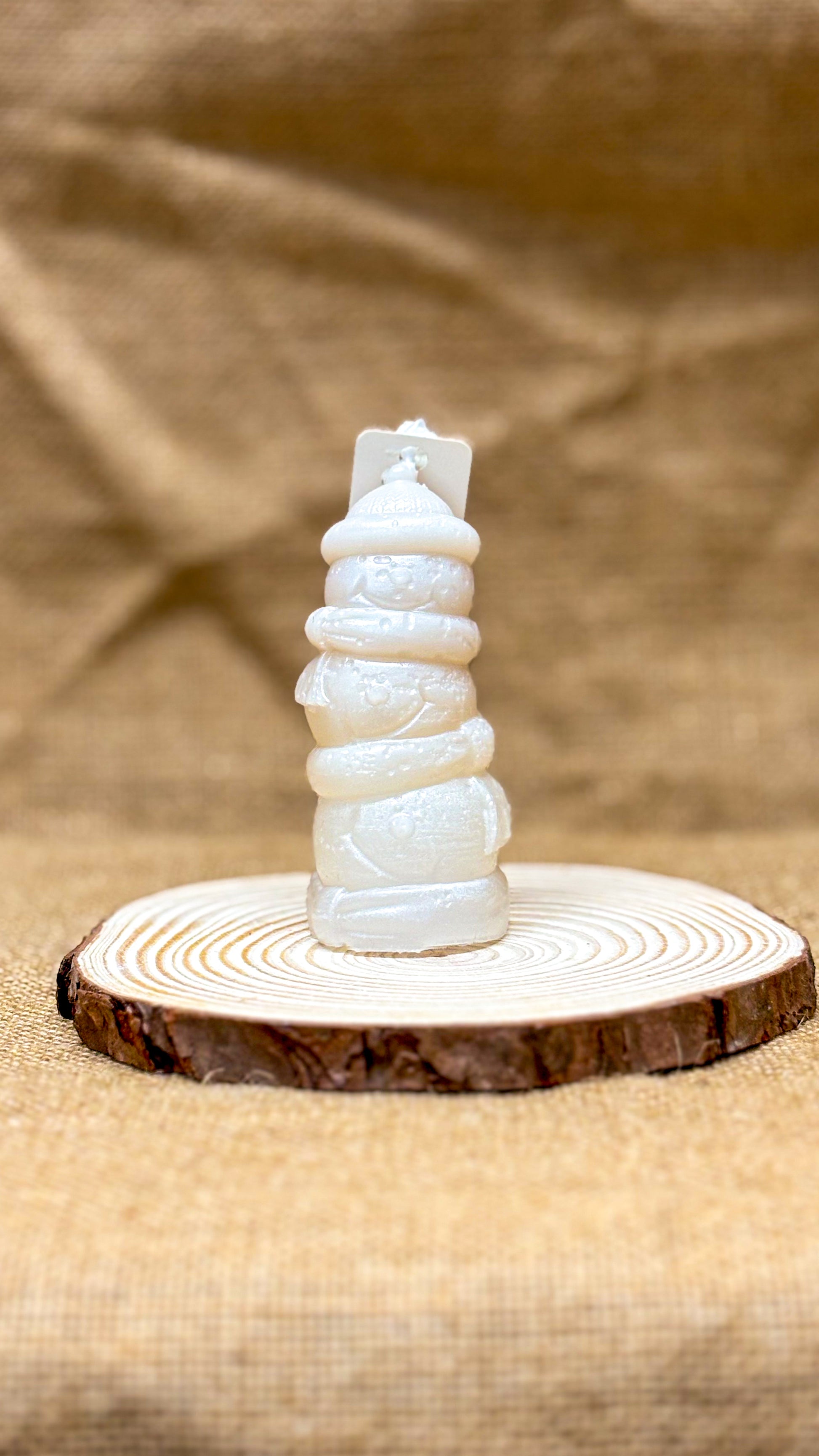 La Candela Triple Snow è un piccolo capolavoro invernale: tre teste di pupazzo di neve impilate una sopra l’altra, ognuna con il suo cappellino, la sua espressione dolce e i suoi dettagli scolpiti con cura. La cera bianca dal finish perlato ricorda la neve brillante sotto il sole d’inverno, rendendo questa candela ancora più luminosa e speciale.