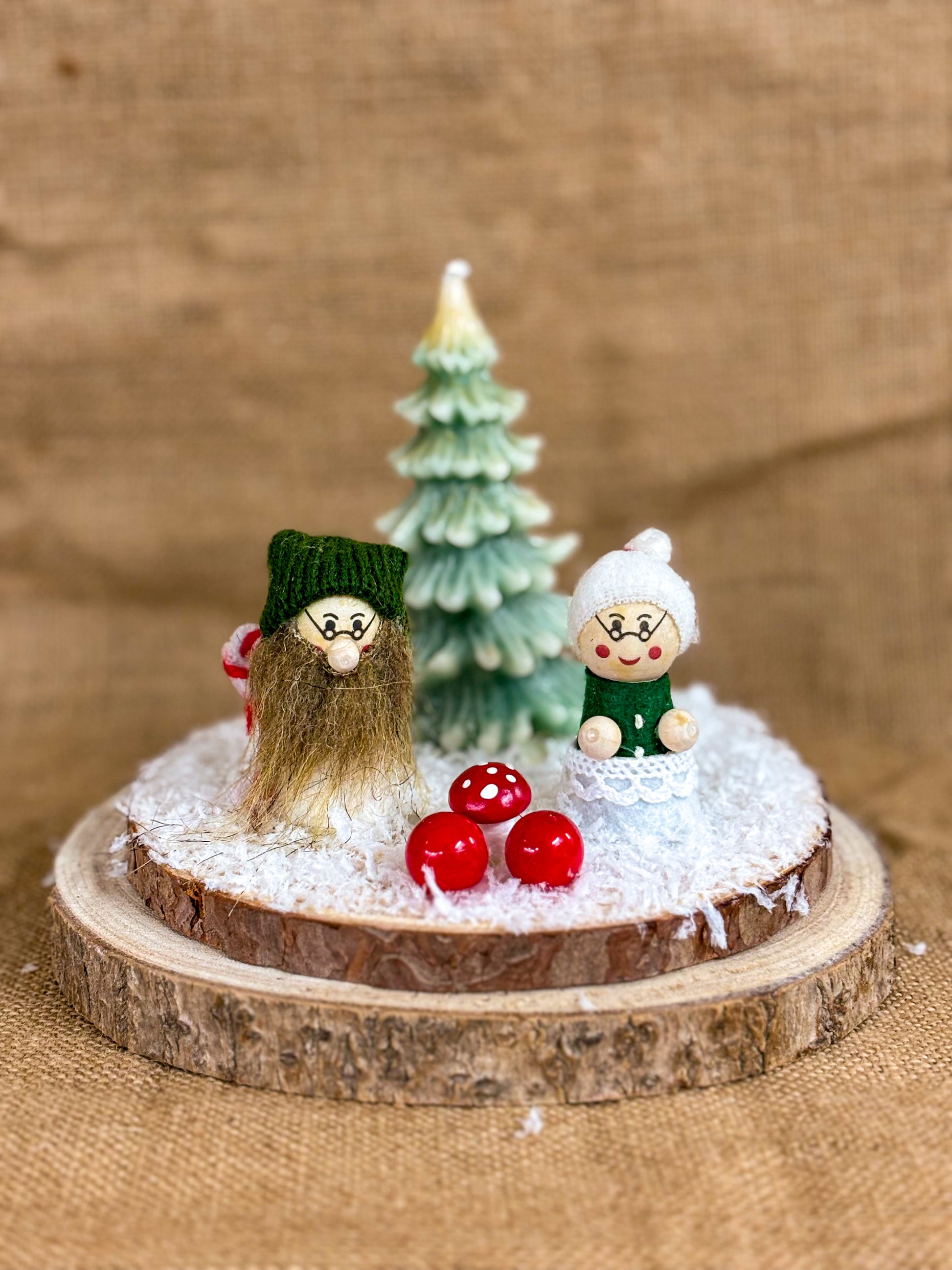 Protagonisti un simpatico nonnino con cappello verde e una nonnina sorridente, circondati da funghetti rossi, neve artificiale e un albero di Natale in cera naturale.