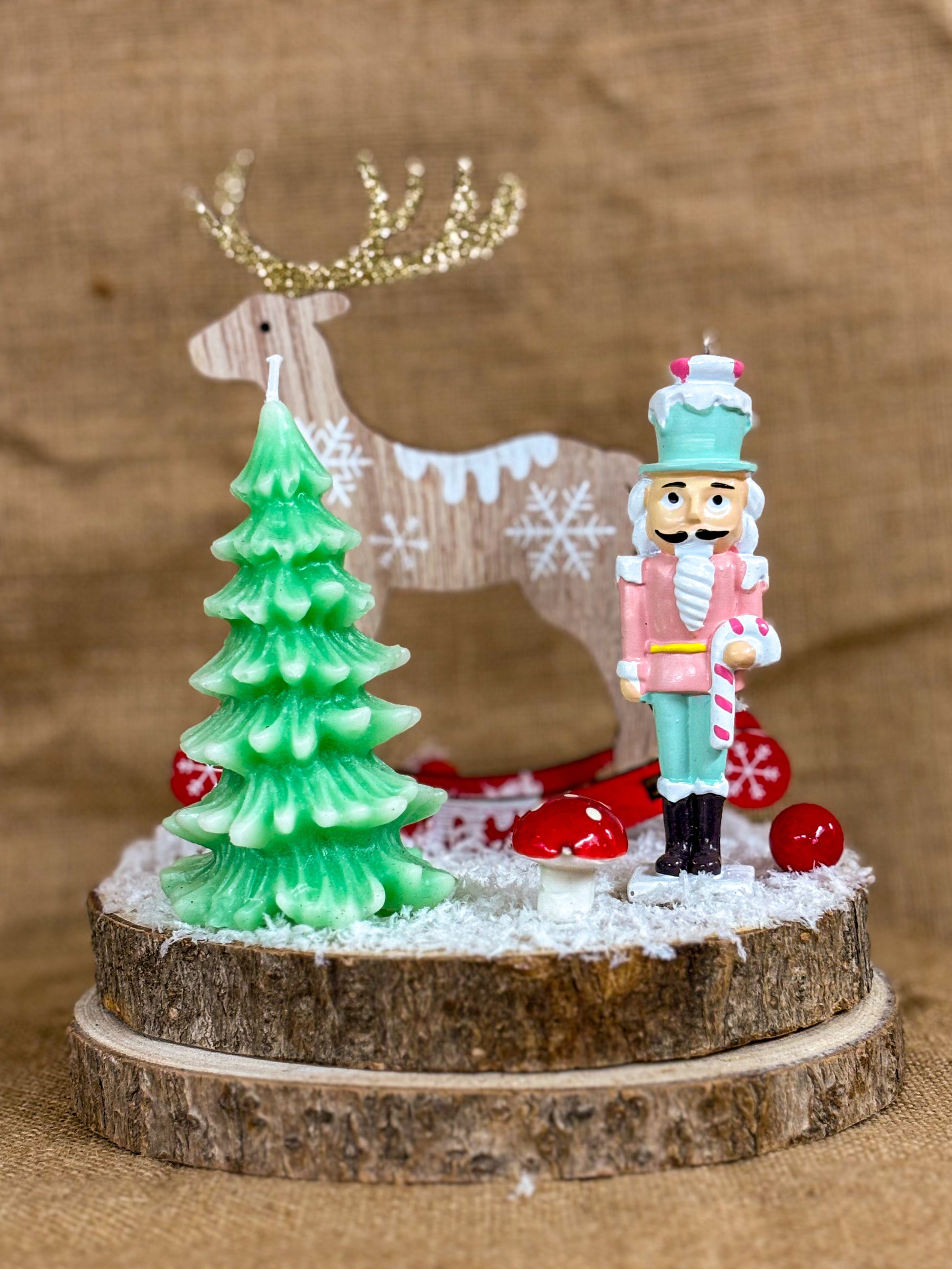 Il protagonista è il classico Schiaccianoci in tonalità pastello, affiancato da un albero di Natale in cera naturale e piccoli dettagli come funghetti rossi, neve artificiale e una renna decorativa sullo sfondo.